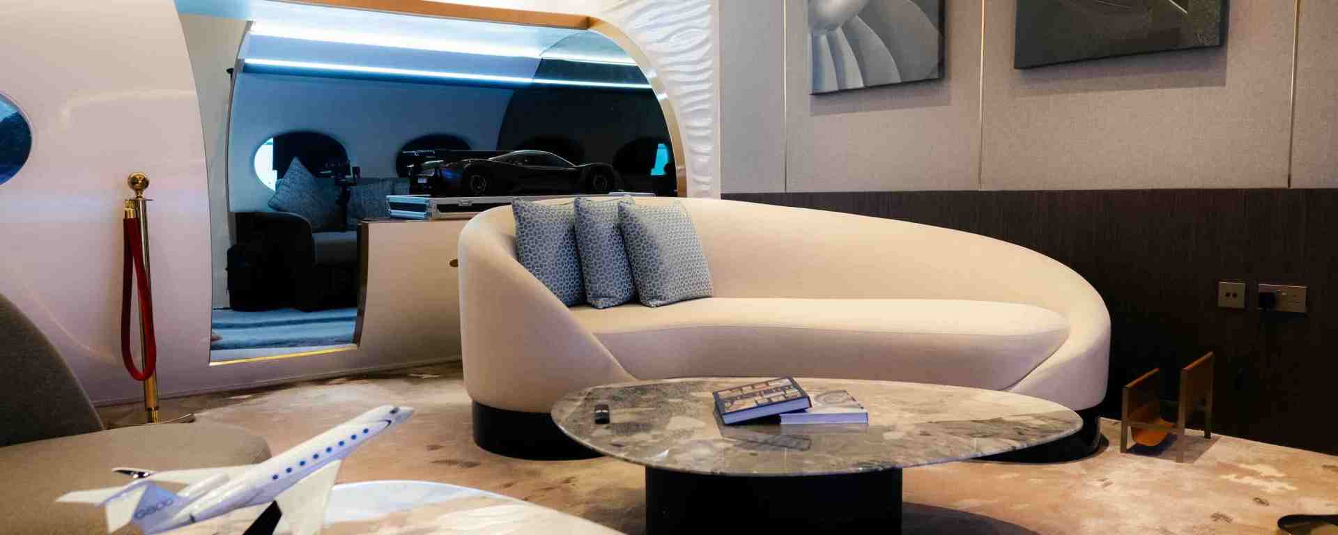 Situated in the atrium of the ultra-luxurious UAE landmark, the impressive space serves as a chic client lounge and sales office, while offering a fully immersive private aviation experience.