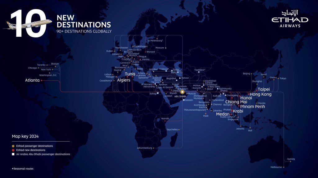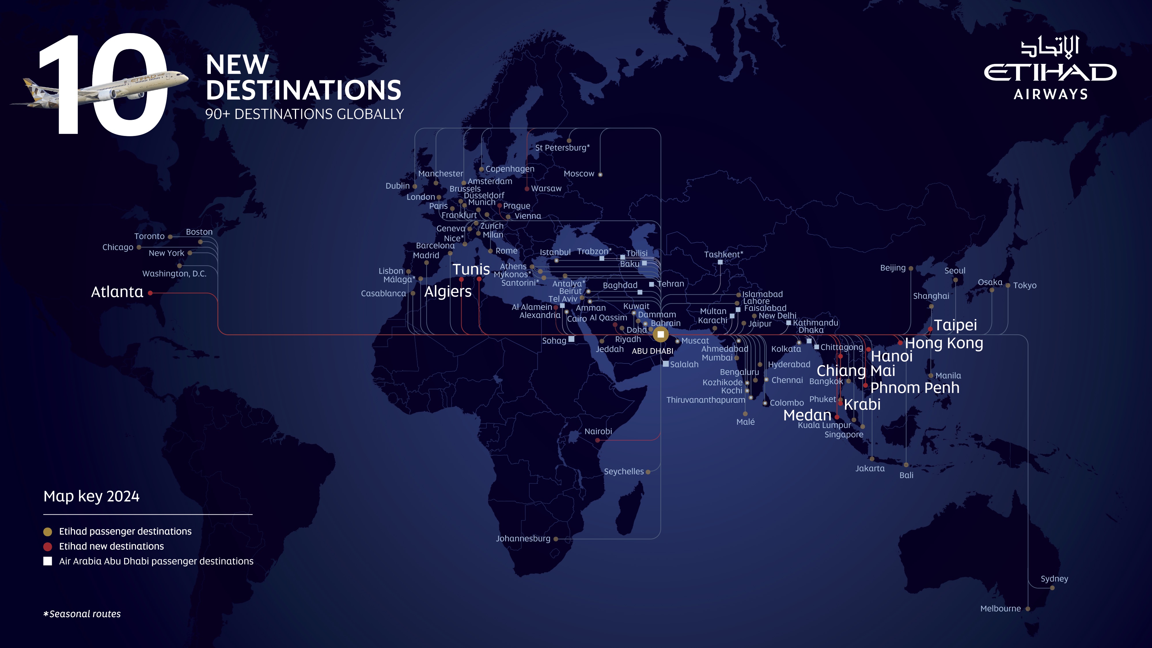 The ten routes announced today will complement Etihad’s previously revealed new destinations for 2025: Prague, Warsaw, and Al Alamein.